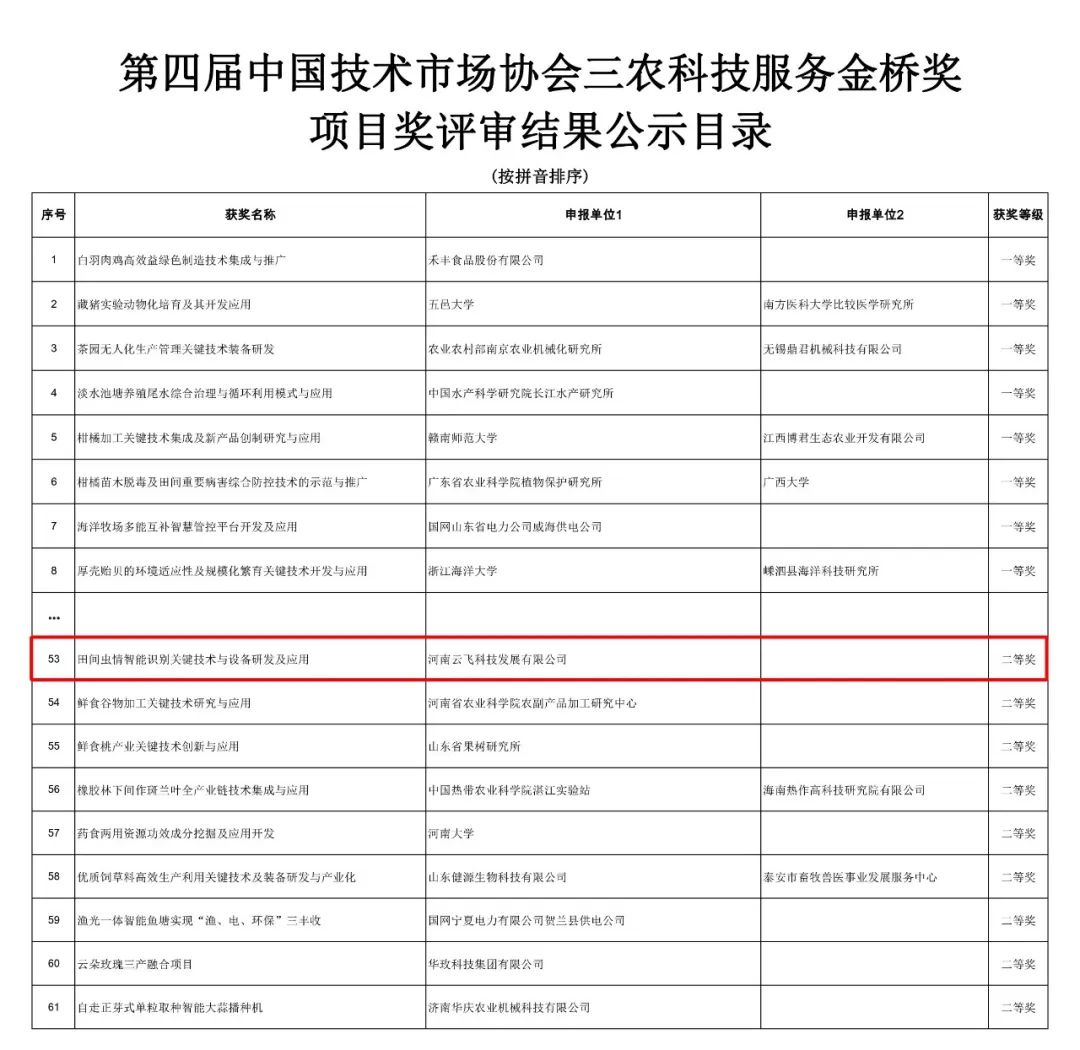 中國技術市場協會第四屆三農科技服務金橋獎評審結果近日揭曉,云飛科技組織申報的"田間蟲情智能識別關鍵技術與設備研發及應用"項目榮獲二等獎。