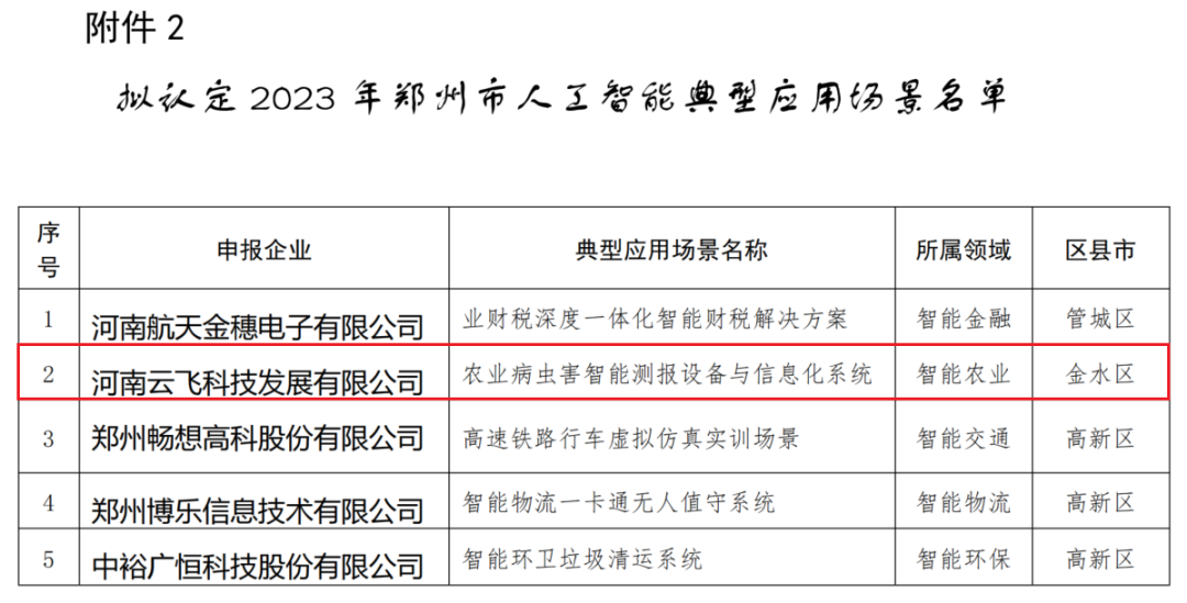 經過材料申報和專家評審,近日鄭州市工信局、市發改委、市科技局聯合公示了2023年度鄭州市人工智能標桿企業和典型應用場景認定結果。 云飛科技被認定為“2023年鄭州市人工智能標桿企業”,云飛科技研發的“農業病蟲害智能測報設備與信息化系統”被認定為“2023年鄭州市人工智能典型應用場景”。