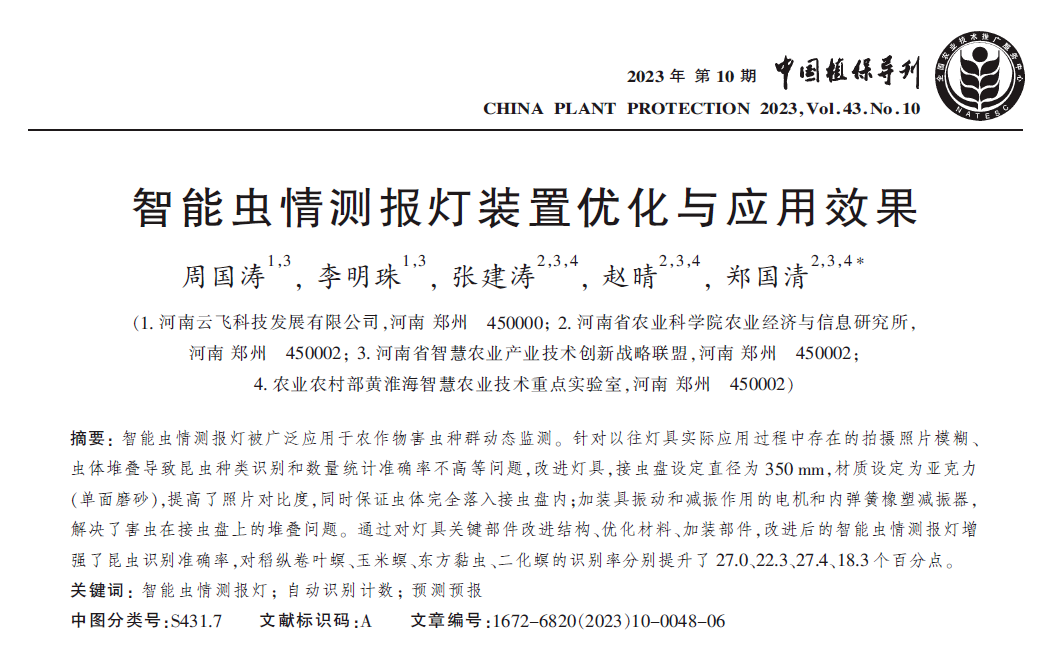 近日,河南云飛科技發展有限公司聯合河南省農業科學院農業信息技術研究所在《中國植保導刊》發表了題為“智能蟲情測報燈裝置優化與應用效果”的研究論文。