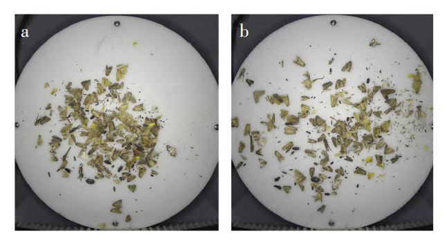 振動開啟前(a)和振動開啟后(b)害蟲分布情況