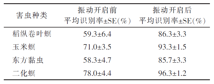 改進后的測報燈,開啟蟲體振動功能后,顯著提升了蟲情圖像采集質量,對稻縱卷葉螟、玉米螟、東方粘蟲、二化螟的識別率分別提升了27.0、22.3、27.4、18.3個百分點。