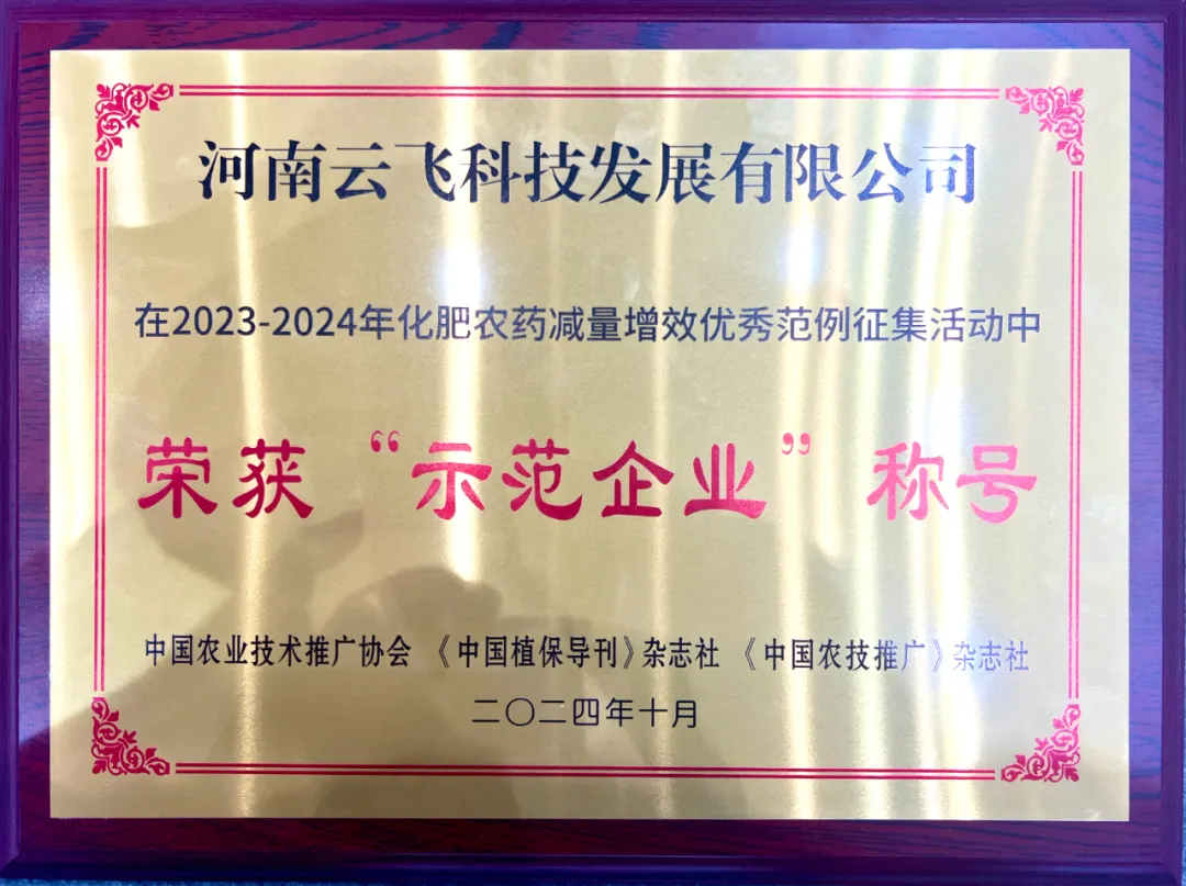 在同期召開的2023-2024年化肥農藥減量增效優秀范例征集活動評選中,云飛科技榮獲“示范企業”稱號。周國濤董事長也因在植保領域的貢獻,在此評選中榮獲“雙減之星”稱號。