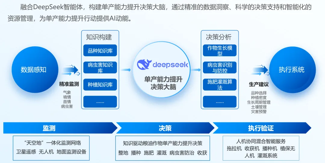 依托DeepSeek農業智能體,可構建面向單產能力提升的智能決策中樞,融合精準數據洞察、科學策略支持與智能資源調配,為糧食單產能力提升提供堅實的AI支撐與技術引擎。