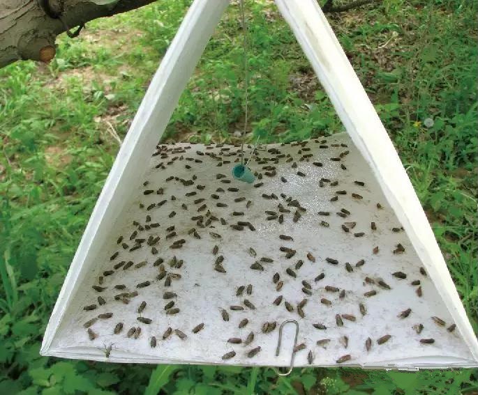 3、誘捕器用量每畝2-3套,每4-6周更換誘芯一次;實時查看誘捕情況,蟲滿或無粘性時更換粘蟲板。
