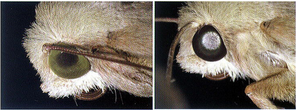 黃色波段燈利用昆蟲復(fù)眼的綠-黃光感受器的生物學(xué)功能。夜出型蛾類的復(fù)眼在白天為明適應(yīng)狀態(tài)(左上圖),夜間為暗適應(yīng)狀態(tài)(右上圖)。